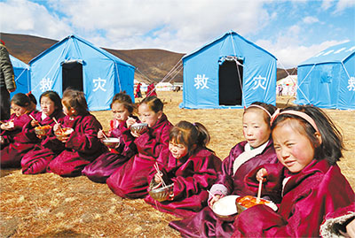 11月23日,位于震中的四川省康定縣塔公鄉多饒嘎目村木雅祖慶學校,師生已全部轉移安置妥善。校長德吉擁忠介紹,學校在一個月前剛剛舉行過地震撤離演習,康定地震時學生撤離有序。 圖為學生們坐在帳篷前吃午飯,雖是露天,米飯、西紅柿炒雞蛋還是讓孩子們吃得津津有味。 本報記者 王明峰攝…[詳細]