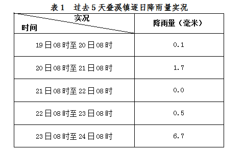 人民網成都6月24日電 (朱虹)記者剛剛從四川省氣象局獲悉茂縣疊溪鎮災區最新氣象。據氣象監測顯示:疊溪鎮近10天降雨量大于0.1毫米的雨日為7天,累計降雨量有11.4毫米;其中昨日至今晨降雨量為6.7毫米,過去5天累計降雨量為9.0毫米。 過去5天逐日降雨量實況見表1: 預計未來三天(…[詳細]