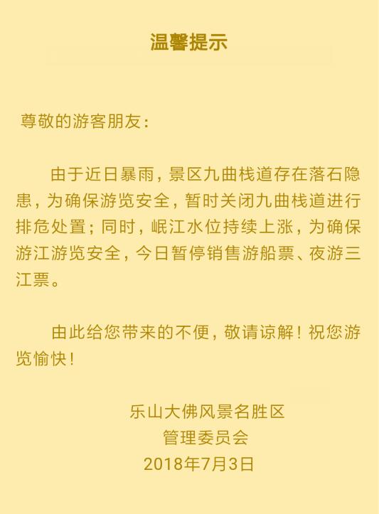 圖自樂山大佛景區網站 人民網成都7月3日電 (任重)據樂山大佛風景名勝區官網消息,由于近日暴雨,景區九曲棧道存在落石隱患,為確保游覽安全,暫時關閉九曲棧道進行排危處置;同時,岷江水位持續上漲,為確保游江游覽安全,今日暫停銷售游船票、夜游三江票![詳細]