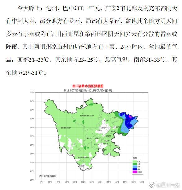 四川省氣象服務中心官方微博截圖 人民網成都7月3日電 (任重)據四川省氣象服務中心官方微博下午消息,今天晚上到明天白天:達州、巴中2市,廣元、廣安2市北部及南充東部陰天有中到大雨,部分地方有暴雨,局部有大暴雨,盆地其余地方陰天間多云有小雨或陣雨;川西高原和攀西地區陰天間多云有雷雨或陣雨,其中甘孜…[詳細]