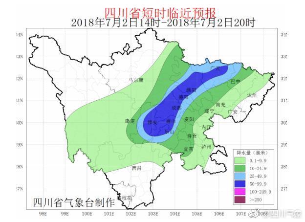 四川省氣象服務中心官方微博截圖 人民網成都7月2日電 (任重)據四川省氣象服務中心官方微博消息,2018年7月2日14時00分四川省氣象臺發布短時臨近預報,7月2日14時~7月2日20時:盆地大部地方陰天有陣雨或雷雨,雨量小到中雨,其中廣元、綿陽、德陽、成都、雅安、眉山、樂山、巴中8市有大雨到暴…[詳細]