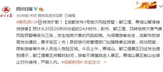 成都發布1號地災風險預警:都江堰、青城山暫停接待游客