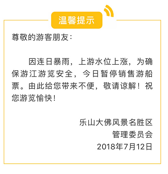 樂山大佛景區官網截圖 人民網成都7月12日電 (任重)據樂山大佛景區官網消息,因連日暴雨,上游水位上漲,為確保游覽游江安全,今日暫停銷售游船票![詳細]