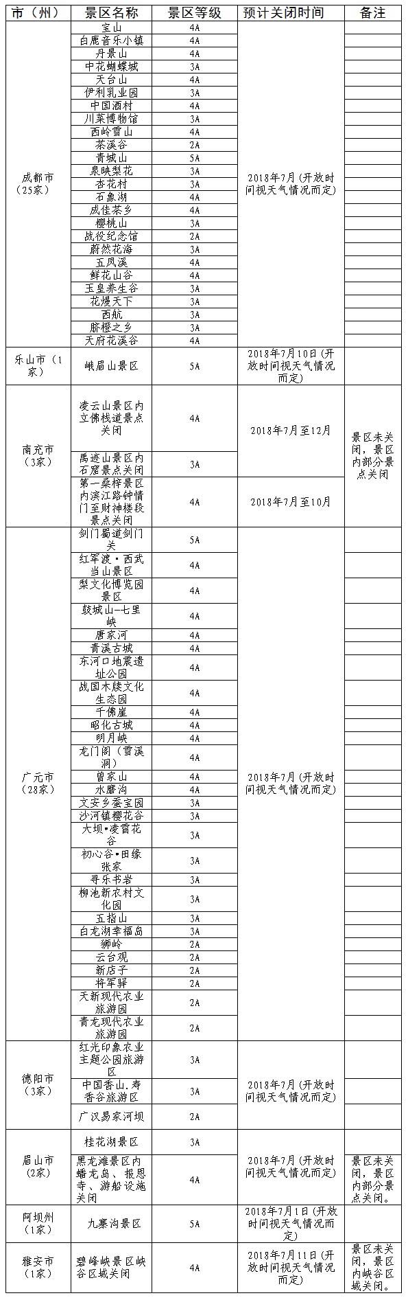 人民網成都7月11日電(任重)據四川省旅游發展委員會官網消息,截至7月11日16:00,由于受強降雨天氣影響,全省7個市(州)64家A級旅游景區(點)存在較大安全風險,暫行關閉。請廣大游客注意自身安全,合理安排出行計劃。 暫行關閉A級旅游景區(點)名單…[詳細]