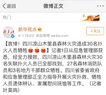 微博截圖 人民網成都4月1日電 (朱虹 ) 據新華社法人微博“新華視點”消息,經全力搜救,四川涼山木里縣森林火災30名失聯撲火人員已全部找到,27名森林消防隊員和3名地方干部群眾犧牲。四川省委省政府和應急管理部正全力指導開展火災撲救、…[詳細]