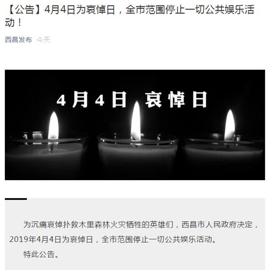 西昌發布官微截圖。 人民網成都4月3日電 (任重)據西昌發布今日消息,為沉痛哀悼撲救木里森林火災犧牲的英雄們,西昌市人民政府決定,2019年4月4日為哀悼日,西昌市范圍停止一切公共娛樂活動![詳細]
