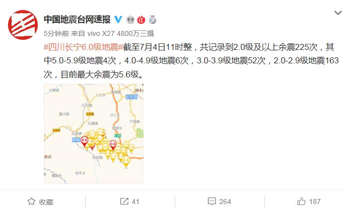國家地震臺網官方微博截圖 人民網成都7月4日電 (任重)據國家地震臺網官方微博消息,#四川長寧6.0級地震#截至7月4日11時整,共記錄到2.0級及以上余震225次,其中5.0-5.9級地震4次,4.0-4.9級地震6次,3.0-3.9級地震52次,2.0-2.9級地震163次,目前最大余震為5…[詳細]