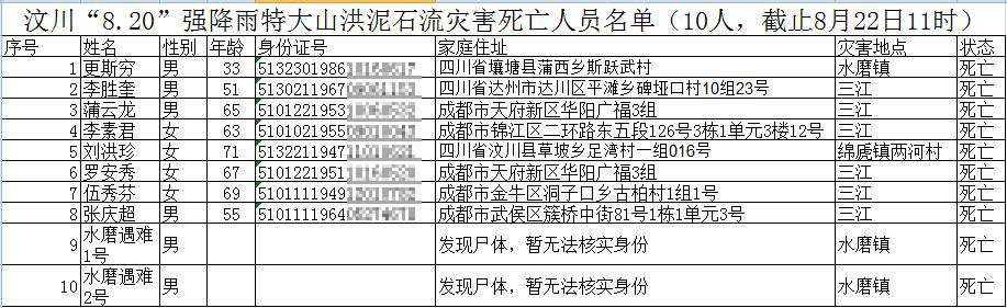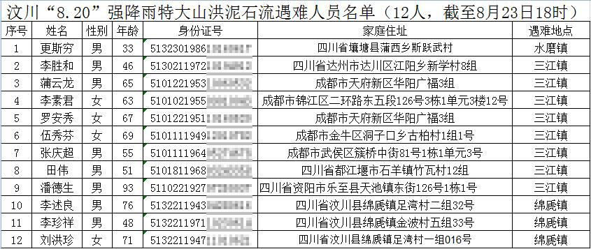 人民網成都8月23日電 (朱虹)記者從阿壩州政府新聞辦獲悉,汶川“8.20”強降雨特大山洪泥石流遇難人員和失聯人員最新名單公布。截至目前,災害共造成12人遇難(身份信息已全部核實完畢)、26人失聯![詳細]
