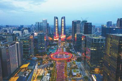 八月二十日,成都﹃三新﹄生活節啟動暨交子大道開街儀式上,“交子之環”和天府雙塔同步點亮,上演燈光秀雙重奏。四川日報全媒體記者吳聃攝 8月20日,在2…