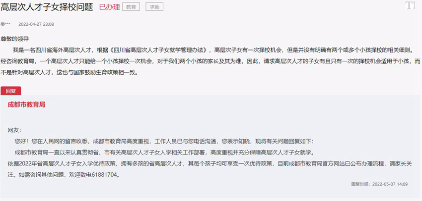 人民網成都5月14日電 (王波)近日,一位網友在人民網“領導留言板”上留言反映:根據《四川省高層次人才子女就學管理辦法》,高層次子女有一次擇校機會,但是并沒有明確有兩個或多個小孩擇校的相關細則。該網友認為,一個高層次人才只能給一個小孩一次擇…