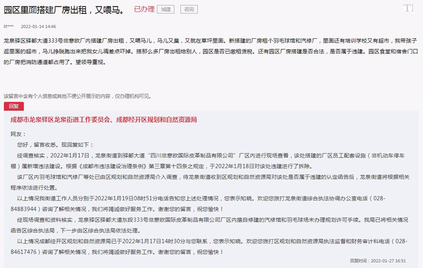 人民網成都2月26日電 (彭茜、趙祖樂)“龍泉驛區驛都大道333號非意歐廠內搭建廠房出租,又喂馬兒。我帶孩子逛里面的超市,馬兒掙脫跑出來把我女兒嚇到了?!苯?,一位四川成都的市民在人民網領導留言板留言稱,其所在園區的非意歐廠區內搭建廠房出租…