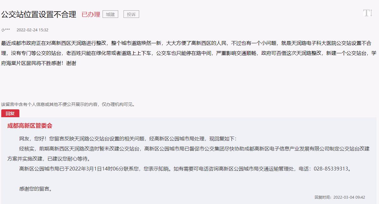 人民網成都3月7日電 (高紅霞)“天潤路電子科大醫院公交站設置不合理,沒有專門等公交的站臺,老百姓只能在綠化帶或者道路上上下車,公交車也只能停在路中間,嚴重影響交通順暢?!苯?,來自四川成都的一位市民在人民網“領導留言板”留言稱,最近成都市…