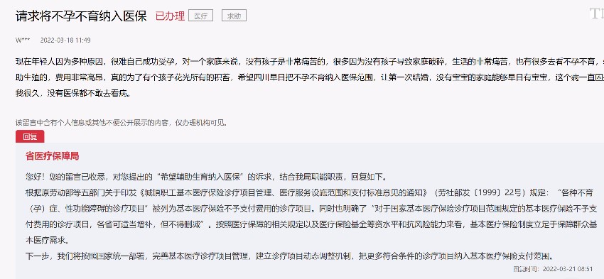 人民網成都3月24日電 (郭瑩)近日,有四川網友在人民網“領導留言板”留言呼吁,希望四川早日把不孕不育診療項目納入醫保范圍。該網友表示,現在因為多種因素,部分夫妻無法成功受孕,對家庭而言,是一件非常痛苦的事情。目前,針對不孕不育診療項目費用…