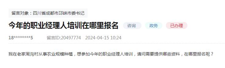 人民網成都5月7日電 (記者張玉琳)近日,有成都網友通過人民網“領導留言板”留言,稱自己目前正在從事農業規模種植,想參加今年的農業職業經理人培訓,詢問在哪里報名,需要提供哪些資料。 人民網“領導留言板”網友留言截圖。 收到留言后,邛崍市委…