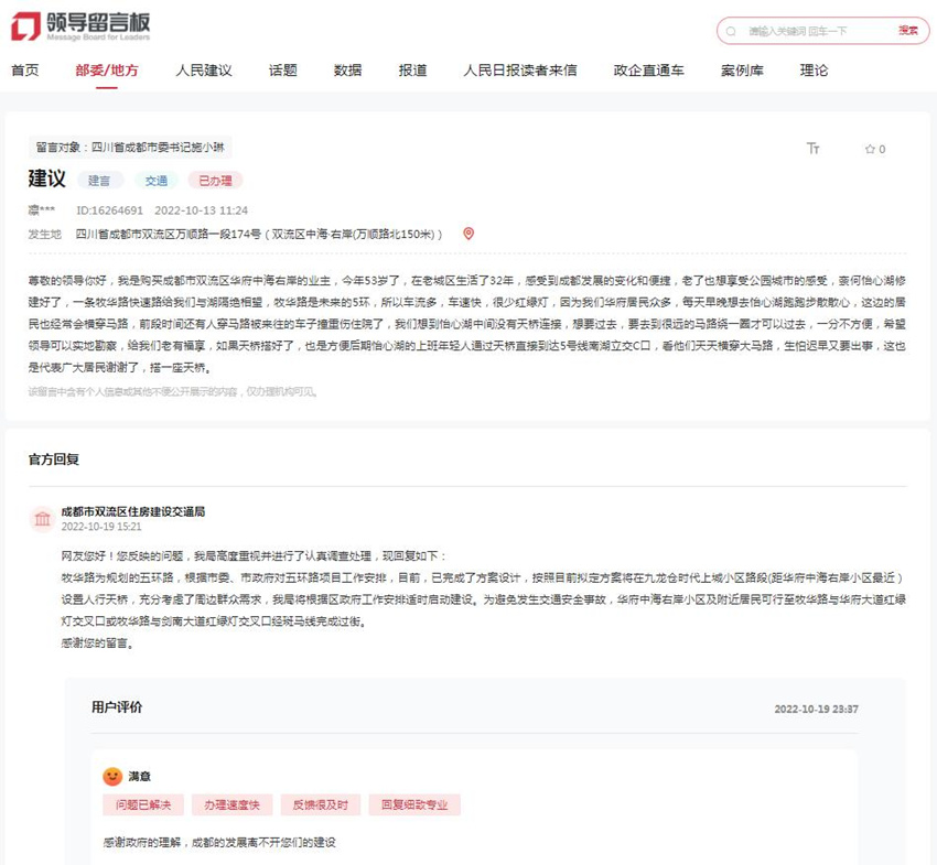 人民網成都10月26日電 (趙祖樂)近日,有來自成都市雙流區的市民在人民網“領導留言板”留言表示,自己居住在怡心湖附近,但前往怡心湖卻需要橫跨牧華路,該道路車流多、車速快、紅綠燈少,橫穿馬路存在很大安全隱患,希望當地政府可以架設過街天橋,?!?/a>