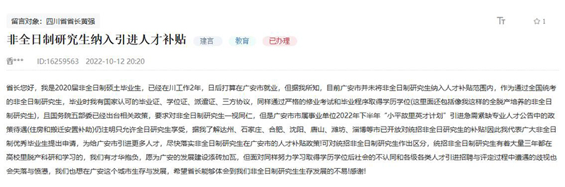 人民網成都11月23日電 (高紅霞)近期,一位網友在人民網“領導留言板”留言,建議四川省廣安市將非全日制研究生納入引進人才補貼范圍,得到當地的肯定回復。對此,該網友給出了“反饋很及時、辦理速度快、回復細致專業、問題已解決”的評價,并表示:“…