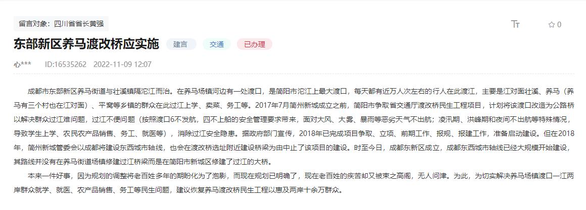 人民網成都11月25日電 (高紅霞)“為切實解決養馬場鎮渡口一江兩岸群眾就學、就醫、農產品銷售、務工等民生問題,建議恢復養馬渡改橋民生工程以惠及兩岸十余萬(名)群眾?!苯?,有網友在人民網“領導留言板”反映,四川省成都市東部新區養馬場鎮沱江…