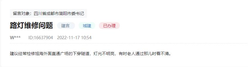 人民網成都11月28日電 (高紅霞)“建議經常檢修旭海外面直通廣場的下穿隧道,燈光不明亮,有時老人通過那兒時看不清?!苯?,成都簡陽一名網友在人民網“領導留言板”反映,當地一處下穿隧道的燈不夠亮,行人通行時容易看不清路。 人民網“領導留言…