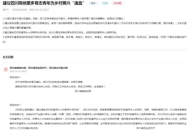 人民網成都12月1日電 (王凡)近日,有四川網友通過人民網“領導留言板”表示,人才振興是鄉村振興的基礎,希望四川吸納更多有志青年參與鄉村振興,給青年人提供更廣闊的發展舞臺。四川省委組織部、四川省農業農村廳、四川省鄉村振興局針對該網友提出的建…