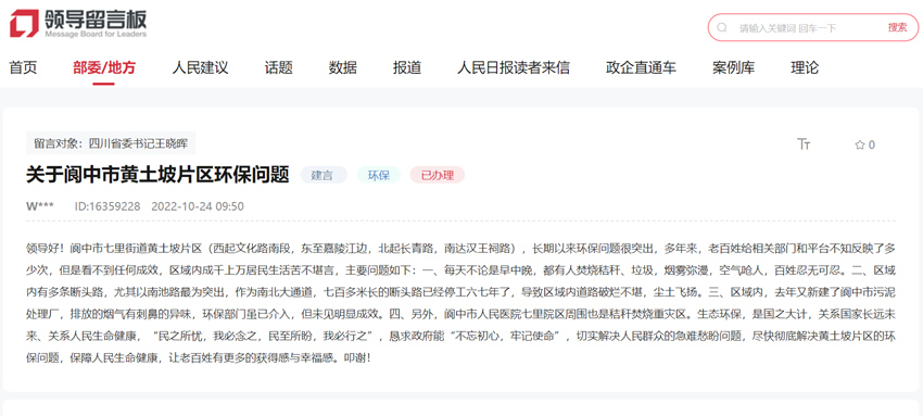 人民網成都11月30日電 (王洪江)近日,有市民在人民網“領導留言板”上反映,四川省南充閬中市七里街道黃土坡片區長期以來環境問題突出,包括斷頭路破爛不堪、塵土飛揚,污泥處理廠排放煙氣有刺鼻異味等,希望政府切實解決。 人民網“領導留言板”網…