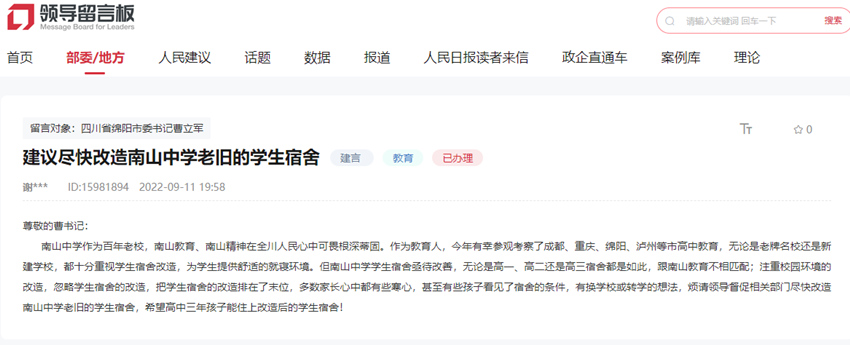 人民網“領導留言板”網友留言截圖。 人民網成都12月2日電 (趙祖樂)“南山中學學生宿舍亟待改善,無論是高一、高二還是高三宿舍都是如此?!苯?,有網友在人民網“領導留言板”留言表示,四川省綿陽市南山中學作為百年老校,南山教育、南山精神在四川…