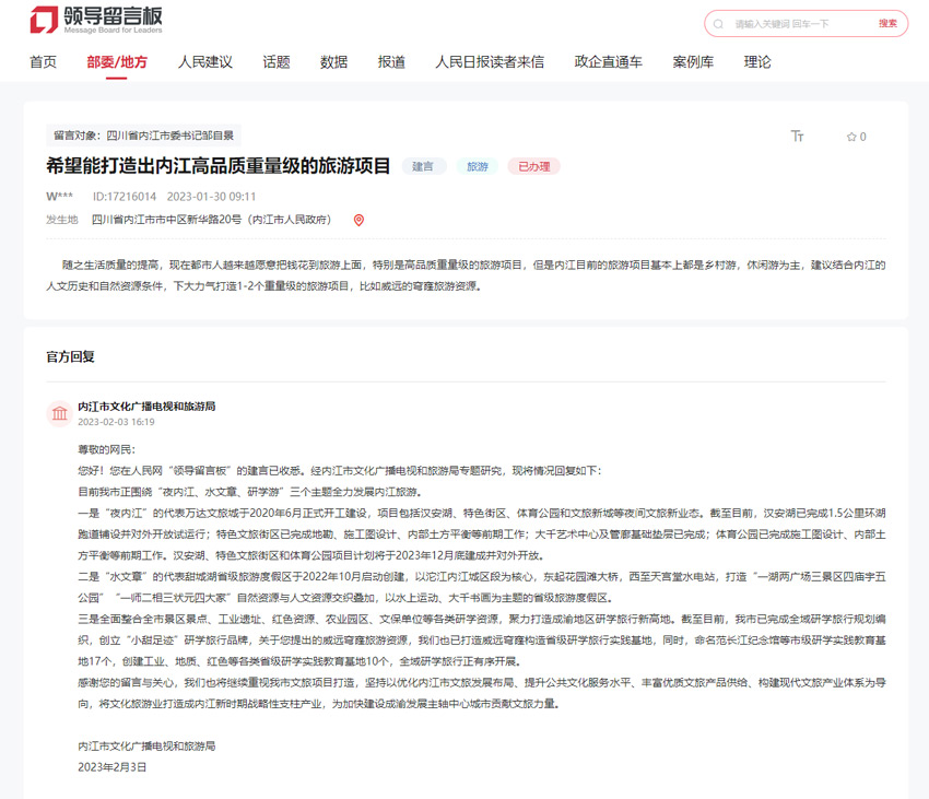 人民網成都2月8日電 (劉海天)近日,有網友在人民網“領導留言板”上給中共內江市委書記鄒自景留言,建議內江打造高品質重量級的旅游項目。內江市文化廣播電視和旅游局就此建議進行了回復,詳細介紹了目前內江市圍繞“夜內江、水文章、研學游”三個主題全…