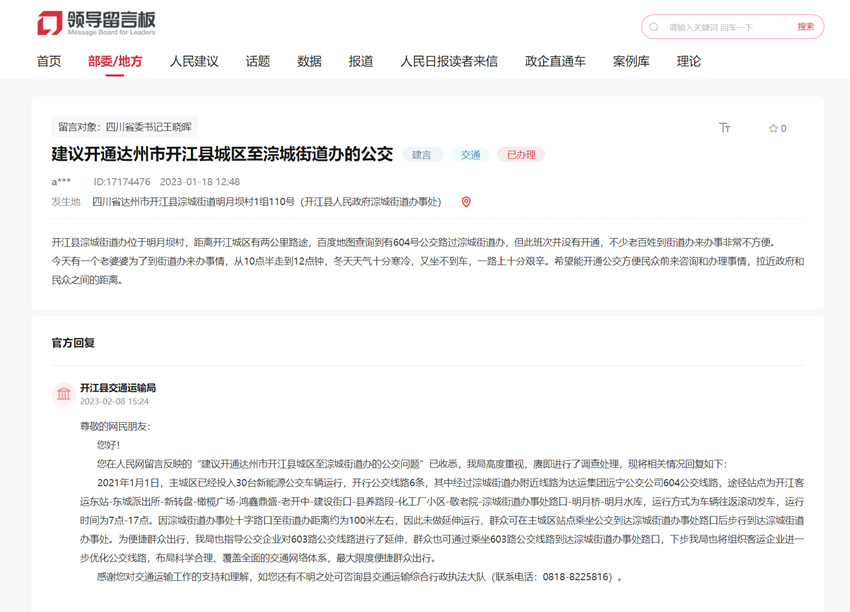 人民網成都3月9日電 近日,四川省達州市開江縣一市民在人民網“領導留言板”留言反映,查詢顯示要路過開江縣淙城街道辦的604路公交車,實際上到不了此地,導致群眾到該地辦事非常不便。對此,開江縣交通運輸局回復:對公交路線進行延伸,解決市民出行不…