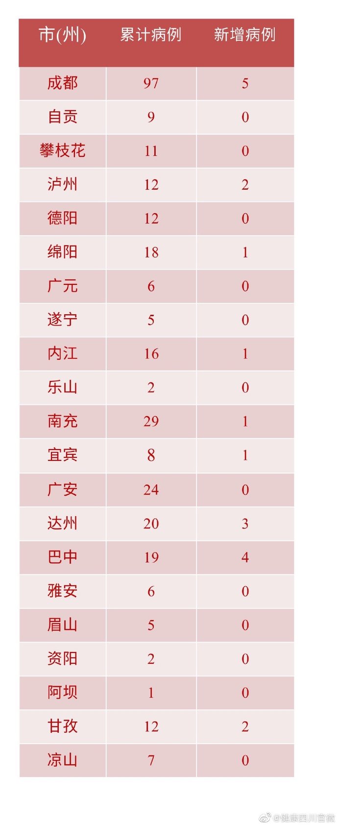 新增確診病例中,成都市5例、巴中市4例、達州市3例、瀘州市2例、甘孜州2例、綿陽市1例、內江市1例、南充市1例、宜賓市1例。