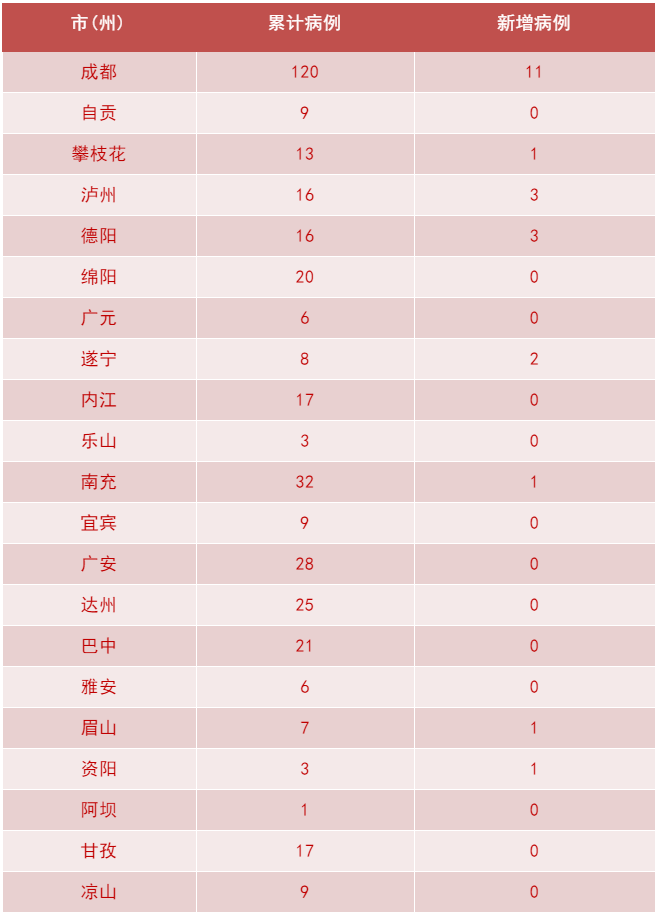 新增確診病例中,成都市11例、瀘州市3例、德陽市3例、遂寧市2例、攀枝花市1例、南充市1例、眉山市1例、資陽市1例。