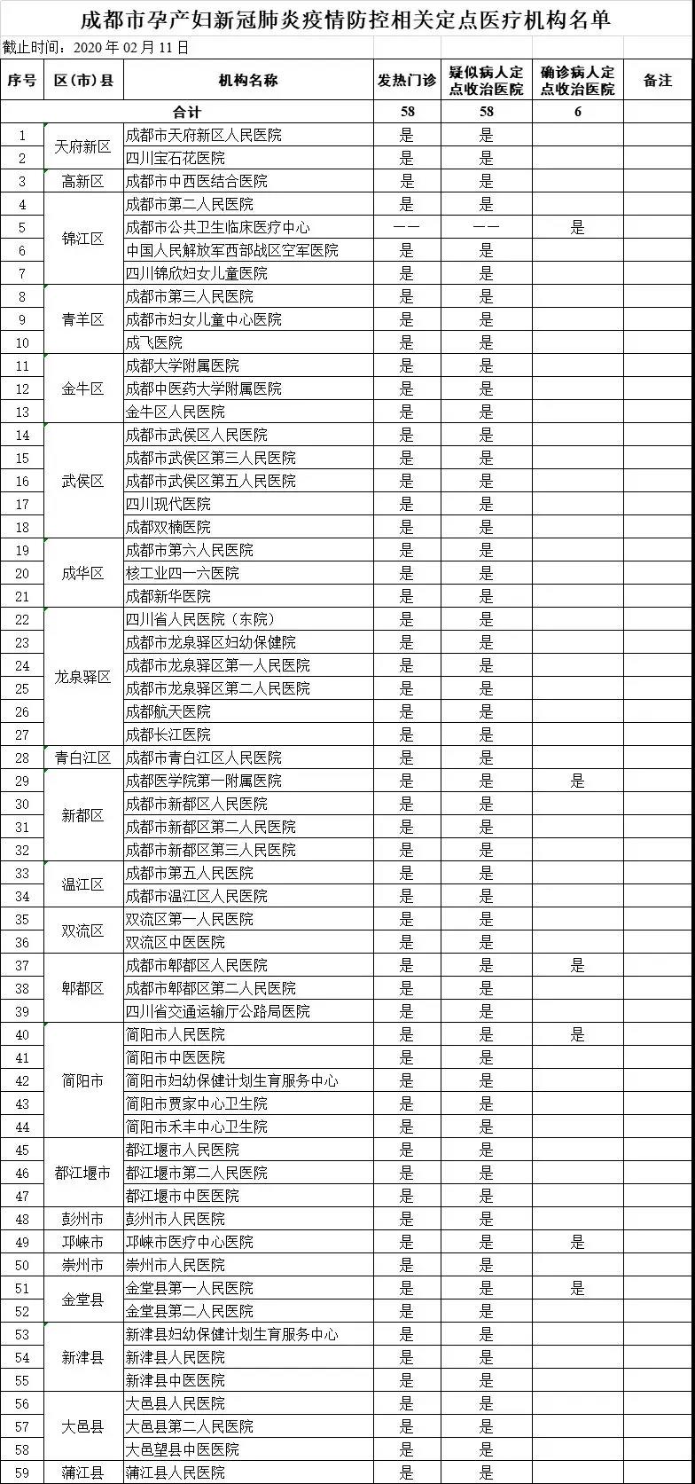 人民網成都2月12日電 (任重)據健康成都官微消息,根據國務院應對新型冠狀病毒肺炎疫情聯防聯控機制下發的《關于加強新型冠狀病毒肺炎疫情防控期間孕產婦疾病救治和安全助產工作的通知》(肺炎機制發〔2020〕25號)文件要求,成都市衛健委確定以下為成都市孕產婦新冠肺炎疫情防控相關定點醫療機構:
