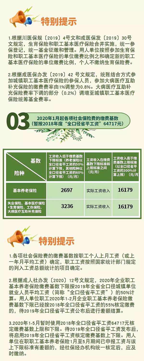 降率,降低企業職工養老、失業、工傷保險費率;調基,調整企業職工養老保險繳費基數下限。今日,成都市人社局發布“調基降率”后用人單位及職工、個體參保人員的最新繳費標準。