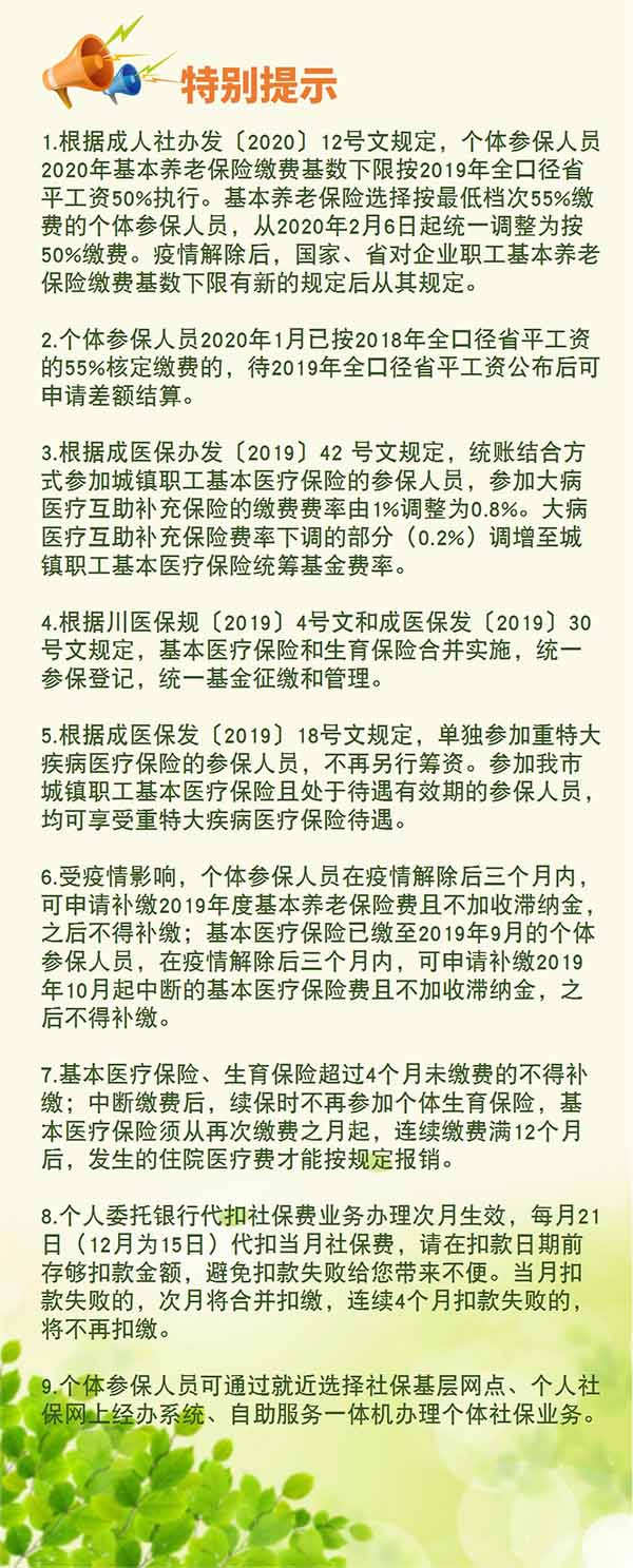 2020年2月6日起,個體參保人員基本養老保險繳費基數下限按社平工資50%執行。疫情解除后,國家、省對企業職工基本養老保險繳費基數下限有新的規定后從其規定。