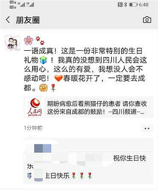 這位病友還在自己的朋友圈說:一語成真!這是一份非常特別的生日禮物!“真的沒想到四川人民會這么用心,這么的有愛。我想沒人會不感動吧!春暖花開,一定要去成都!”