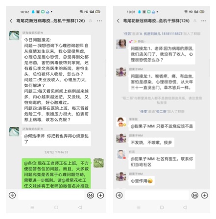 “心里憋得慌是怎么回事”“我現在壓力好大,一會兒還要出去上班”“喉嚨癢、痛、有血絲,害怕是感染”“因為病毒的原因,我們店關門了,我又沒有了收入,心里很恐慌怎么辦”“我看好多人在屯糧,我心里也有些恐慌,到底要撐到什么時候”“壓力大,失眠,睡覺感覺又像睡著了,又像沒睡著”……不到2個小時,已有10余個人將自己的焦慮、不安等情緒問題拋向群里。