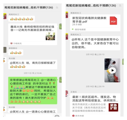 此外,嘉陵區婦聯主席陳燕每天不間斷地向群里推送戰疫一線的最美“逆襲者”事跡,并引導“鳶尾花”志愿者們及時推送官方發布的疫情信息和應對新型冠狀病毒肺炎疫情心理調適指南等知識。