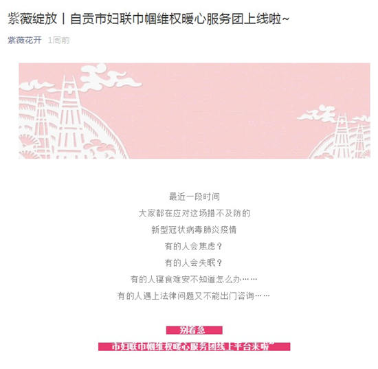 在抗疫特殊時期,為促進家庭平安、社會穩定,自貢市婦聯及時組織發動全市各級婦聯組織、巾幗女律師服務團、女性社會組織、巾幗志愿者等,認真做好法治宣傳和心理援助、維權服務等工作,在特殊時期為婦女姐妹及家庭帶去關愛和溫暖。