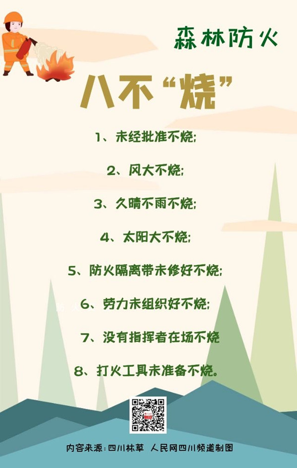 人民網成都4月3日電 4月1日,應急管理部發布消息,預計4月2日至6日,四川南部局部地區森林火險等級將達到極度危險級別,防火形勢異常嚴峻,國家森林草原防滅火指揮部辦公室特向四川省發布高森林火險紅色預警。當下,氣溫迅速回暖,野外風干物燥,是森林火災的高發期,特此提醒廣大市民:進入林區必須嚴格遵守森林防火“十不準”“八不燒”規定。