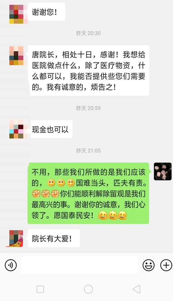 隔離不能隔愛。我們醫院雖然沒有感染科,沒有救治確診病人。重大疫情來襲,我們能夠沖在前面,為打贏疫情阻擊點貢獻自己的力量,也算是有了點滴用武之地。