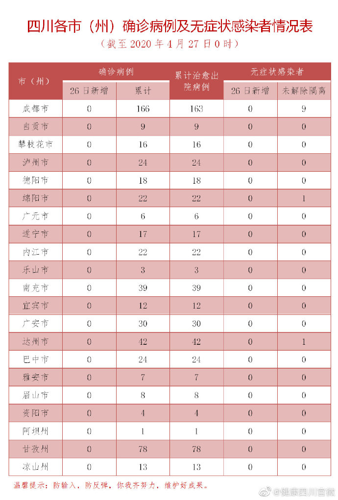 人民網成都4月27日電 (王波)記者從四川省衛健委獲悉,4月26日0-24時,四川無新增新型冠狀病毒肺炎確診病例,無新增疑似病例,157人尚在接受醫學觀察。