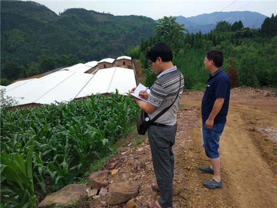 王文彬(右)介紹雙鳳村新建的飼養基地
