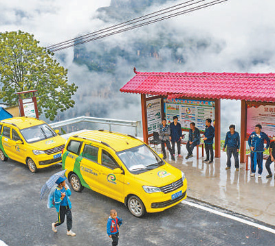 6月30日,兩輛四川鄉村客運面包車在阿布洛哈村等待乘客。新華社記者 江宏景攝