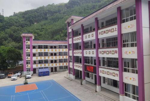 楊河鄉中心小學的校長汪學軍從教學樓下迎上前來,他帶領我們在校園內大致走了一圈,并通過文化墻的圖片向我們對比了近年來隨著脫貧攻堅進程的縱深推進,在黨和政府及社會多方面力量的大力幫扶下,昔日老舊校園化繭成蝶的變遷。