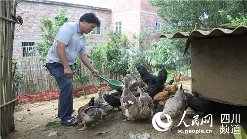 譚俊新正在喂養家里的雞鴨。廣西新聞網記者林亮 攝