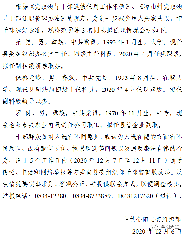 干部群眾如對以上人選有不同意見,或認為人選在德的方面有不良反映,或有跑官要官、拉票賄選等問題以及違反廉潔自律的行為,請于5個工作日內(2020年12月14日至2020年12月18日)通過信函、電話和網絡舉報等方式向縣委組織部干部監督股反映。反映情況要實事求是、客觀公正,并提供聯系方式,以便調查核實。