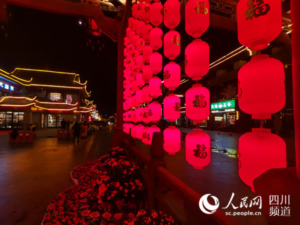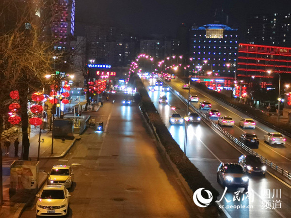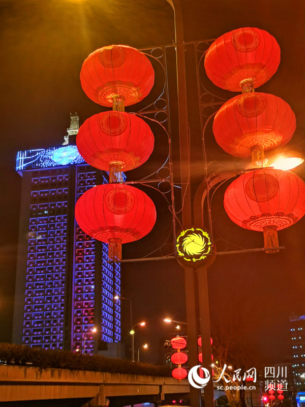 春節臨近,成都市的街道兩旁掛起了一串串紅燈籠,這些紅燈籠排列成既威武又喜慶的迎春陣勢,紅色的燈光襯托得錦城的夜色愈發美麗。