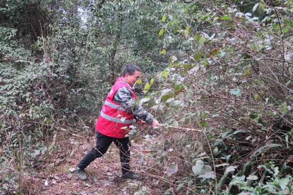 2月8日早上7時許,游小軍吃過早飯,穿上迷彩服、膠鞋,戴上森林執勤袖章,背上水壺,拿著砍刀,又開始了一天的巡山護林工作。