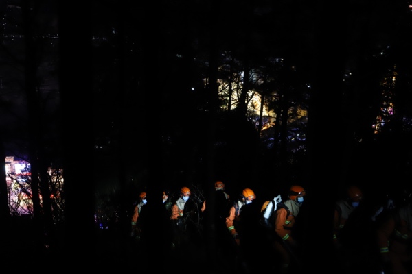 除夕夜,三路“橙紅”背負重達20公斤的滅火機具在海拔2850米,溝谷縱橫、雜灌叢生的四川甘孜康定市跑馬山上艱難穿行……