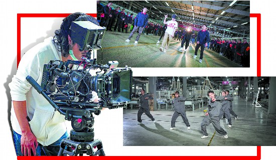 “跑得再整齊一點”“大家的表情再舒展一些”……昨日下午兩點,記者來到前鋒集團西區產業園拍攝現場,身著工作服的近20位青年,手舉旗幟,闊步奔跑。據負責現場拍攝工作的前鋒工作人員吳瑕介紹,當日的拍攝共有三個室內場景,一個室外場景,參與的職工有150多人!敖拥脚臄z通知后,我們在前期進行了充分溝通和精心籌劃,選取的幾個場景有故事、有特色、有意義,員工的參與熱情也很高!庇浾咦⒁獾,為了呈現出最好的畫面效果,僅一個奔跑的鏡頭就拍了六七次!靶量啻蠹,你們這組可以‘殺青’了!”現場導演雷海宣布,于是大家鼓掌、歡呼,而攝制組沒有片刻休息,轉場進入熱水器專配車間,準備最后一個場景的拍攝。9000平方米的車間,被打造成了一個臨時的攝影棚——中間留出的一塊空地就是表演舞臺,說唱歌手、舞蹈演員輪番上場錄制。值得一提的是,5位舞蹈演員都是普通職員,或許是首次參與MV拍攝還有些緊張,導演提醒大家別太拘謹,動作可以再舒展些,兩次試拍后,演員漸入佳境,跟著音樂跳起街舞,動感十足。同事笑著說,這幾位平時就有舞蹈特長,可沒想到跳得這么好。