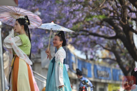 據了解,這是一次當地漢服愛好者群友的自發活動,只為著漢服拍藍花楹,留下美麗倩影的同時,為自己生活工作的城市做宣傳,把西昌的美傳播出去。