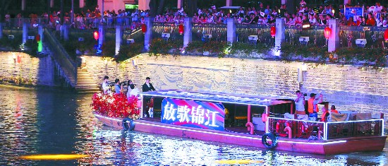 “唱支山歌給黨聽,我把黨來比母親……”記者在東門碼頭現場看到,數十面大鼓一字排開,在一聲令下后齊聲震撼開場。隨著“贊歌領唱人”乘船現身,在響亮的《唱支山歌給黨聽》歌聲中,“全民歡唱”開啟;在水津橋及周邊歡唱點,當“贊歌領唱人”乘船行至水津橋水域時,“贊歌領唱人”與橋面市民群眾互動歌唱,“橋面+水面”的律動音樂新場景呈現;在慶齡碼頭—蘭桂坊場景,兩岸布置拉歌區,“贊歌領唱人”乘船與兩岸群眾共同演繹贊歌;在合江亭—音樂廣場場景,作為“放歌錦江”活動主舞臺,所有“贊歌領唱人”將匯集于水上舞臺,將歡唱的現場氛圍推向高潮……